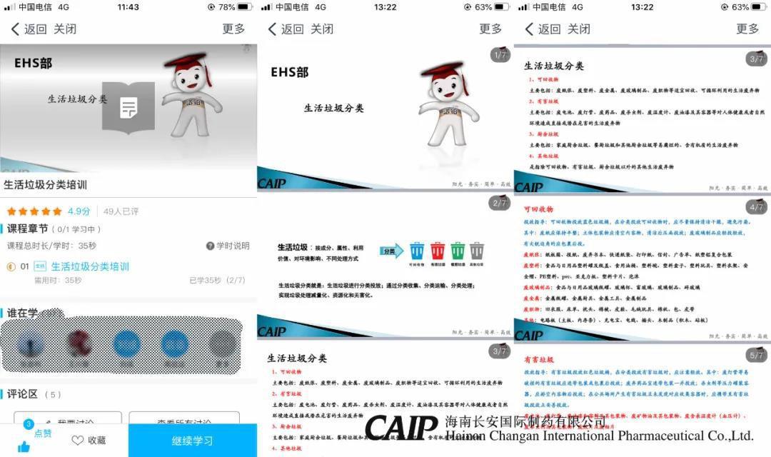 當天,長安制藥還通過網上益佰云學院對全體員工進行了“生活垃圾分類”的在線培訓,確保廣泛深入、全面系統的對員工了解并熟知生活垃圾四分類原則、垃圾投放要求、垃圾收運過程、全公司分類垃圾桶設置等。